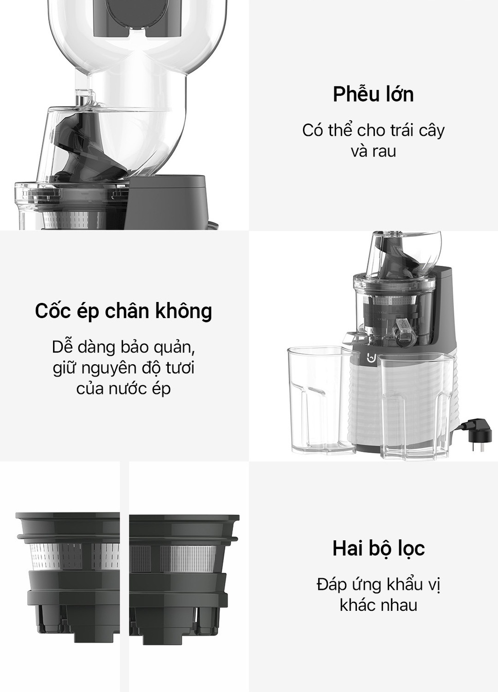 Chỉ mất một thời gian ngắn máy đã vắt được một cốc nước trái cây nguyên chất nhưng vẫn giữ được hương vị tươi ngon và hàm lượng dinh dưỡng vốn có của hoa quả. Qua những bài kiểm tra khắt khe với các dòng máy ép thông thường trên thị trường, máy ép đa năng BUD BJ-32 mang đến trải nghiệm sử dụng tốt hơn với lượng nước ép nhiều gấp 1.5 lần. Đặc biệt, với những nâng cấp và cải tiến mới máy ép đa năng BUD BJ-32 ép được rất nhiều loại nguyên liệu từ rau, củ, quả, các loại đậu,…mang lại nhiều loại thức thức uống tươi ngon khác nhau phục vụ các thành viên trong gia đình.