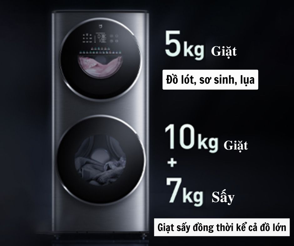 Máy giặt sấy Xiaomi Mijia 15kg M21 thiết bị gia dụng hoàn hảo tiết kiệm không gian trong khi thực hiện đồng thời nhiều tác vụ giặt và sấy với tổng công suất của máy là 15kg, trong đó công suất tối đa của trống trên là 5kg trong khi trống dưới là 10kg. Hơn nữa, máy giặt sấy Xiaomi Mijia M21 15kg hỗ trợ sấy khô 7kg và tầng dưới 10kg lớn hơn có thể giặt nhiều loại quần áo, bao gồm ga trải giường, quần áo người lớn và các chất liệu dày hơn. Đối với tầng phía trên, nó được thiết kế để giặt quần áo tinh tế hơn như lụa, quần áo trẻ em và đồ lót.
